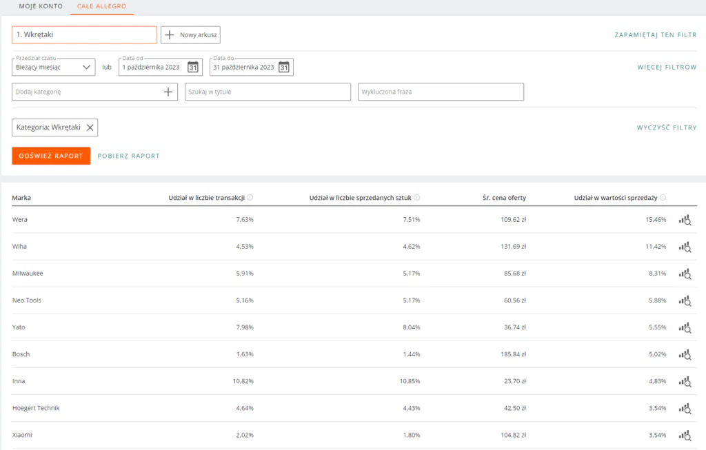 Jeżeli jesteś producentem/marką, możesz monitorować udział sprzedaży swoich produktów w całej sprzedaży na Allegro. Takie informacje dadzą rozeznanie, jak wypada Twoja marka na tle konkurencji. Czy udział wzrasta, a może maleje? Na podstawie m.in. tej informacji można zmodyfikować swoją strategię działania i upewnić się, że dotychczasowe działania przynoszą wymierne zamierzone efekty.